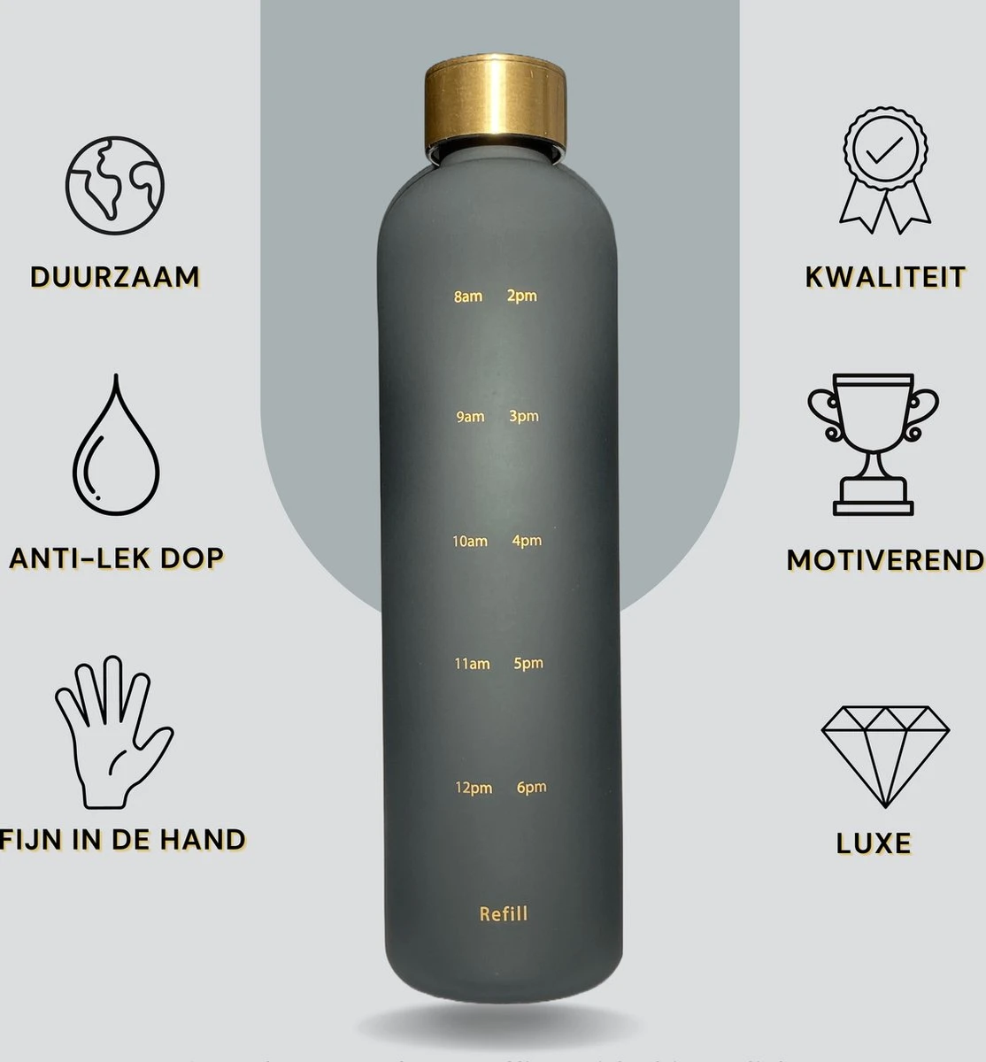 Een mens bestaat voor wel 65% uit water. Niet vreemd dus, dat water drinken super belangrijk is! Merk jij dat je vaak hoofdpijn hebt of futloos bent? Grote kans dat het aan jouw hydratatie ligt. Veel mensen hebben een druk leven, waardoor je niet denkt aan genoeg drinken. De 2Refill fles zorgt er dankzij de tijdsmarkeringen voor dat jij jouw belangrijke slok water nooit meer vergeet en daardoor aan een gezondere levensstijl kunt voldoen!